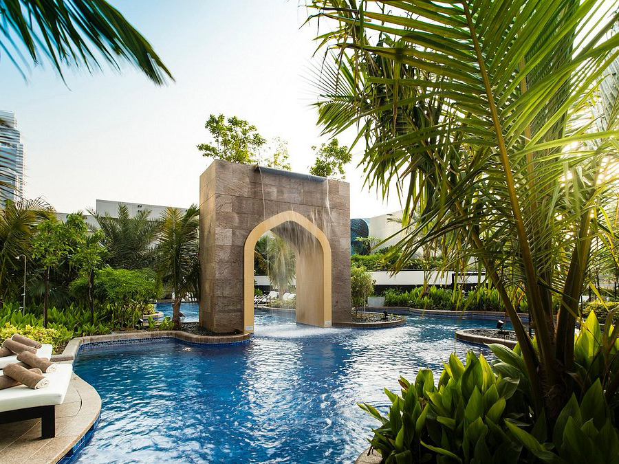 Conrad Dubai features a tranquil rooftop pool area where guests can unwind and soak up the sun.